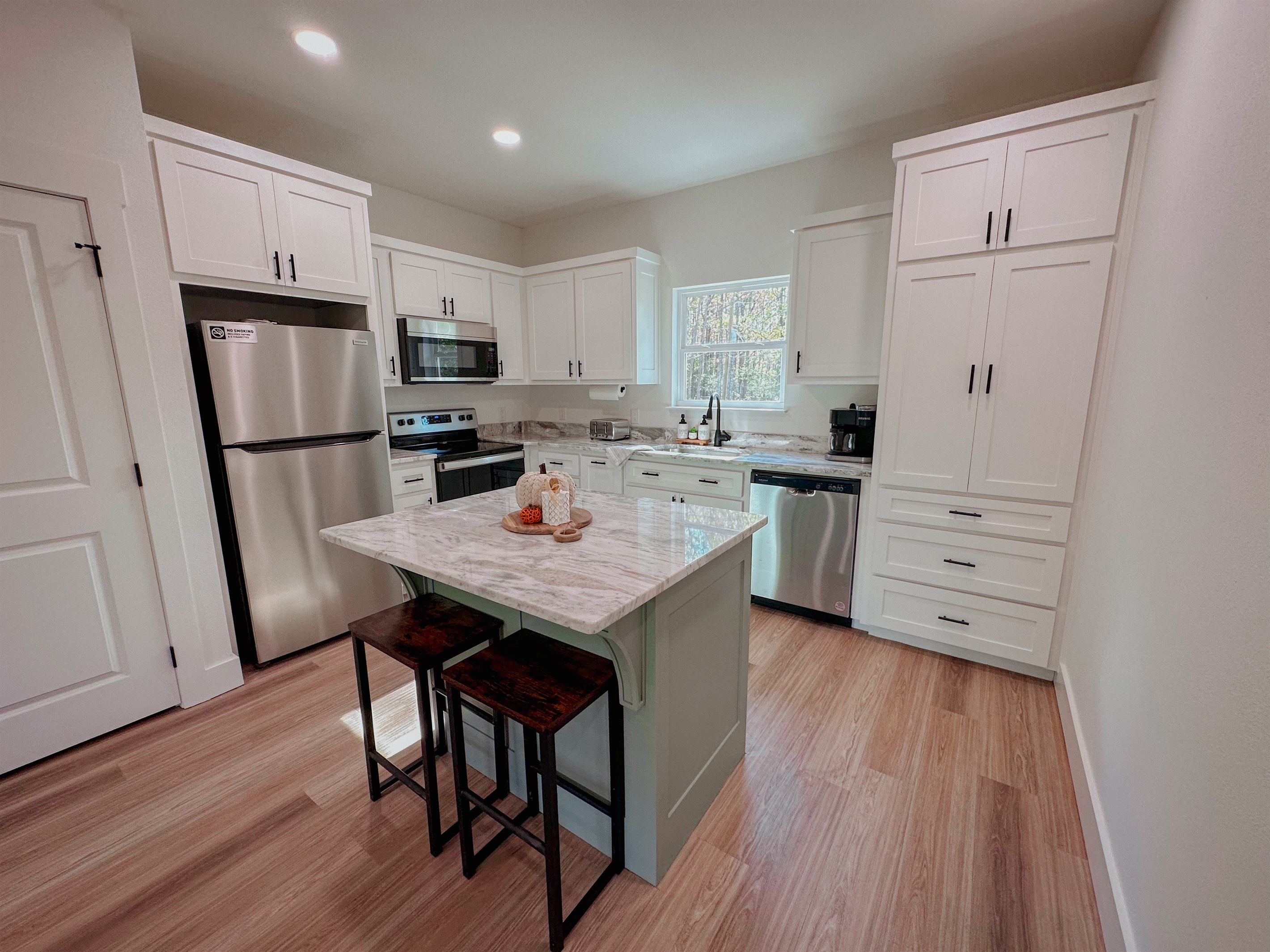 The kitchen is open to the living area. It is fully equipped with new stainless-steel appliances, granite counter tops, plenty of cabinet space and an island that seats 2 guests. Included in the kitchen is a coffee and wet bar area nestled in the oversized cabinet area.